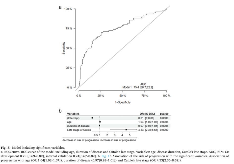 - Après avoir testé un modèle incluant toutes les variables potentielles permettant de prédire l’aggravation du patient, il s’avère que le modèle plus simple construit avec les seules variables statistiquement significatives dans le premier modèle (âge plus avancé, courte durée de la maladie, stade tardif de Cutolo) était aussi puissant pour prédire une progression sévère qu’un modèle utilisant tous les paramètres connus pour être prédictifs (respectivement ASC [95 %CI] 0,74[0,67–0,82] vs 0,73[0,64–0,77], Fig.1 correspondant à la Fig.3 de cet article en copie ci-dessous).